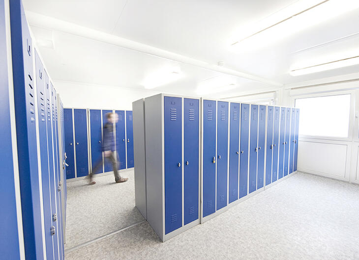 Hier kunt u uw werk- of sportkleding kwijt: ELA units voor kleedruimtes overtuigen doordat ze ruim en functioneel zijn. De ruimteoplossing voor kleedruimtes is naar wens volledig uitgerust met afsluitbare kledingkasten en robuuste zitbanken. Optioneel kunnen de ramen van privacyfolie worden voorzien. Toepassingsgebieden voor de ELA kleedunit reiken van bouwplaatsen en sportcomplexen tot en met de medische sector en de landbouwsector.