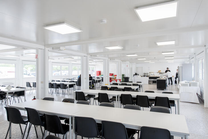 Uitgerust met tafels en stoelen is een kantine in de flexibel te combineren ELA units direct klaar voor gebruik. Ook ruimteoplossingen met een groot oppervlak zijn mogelijk. Deze zijn bijvoorbeeld geschikt als langdurige aanvulling op het hoofdgebouw bij ruimtegebrek of als tijdelijk onderkomen tijdens verbouwingen.